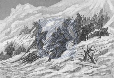 საბრძოლო იარაღის ატანა უმურგაჩის მთაზე გენერალ ველიამინოვის არმიის მიერ. გრავიურა.