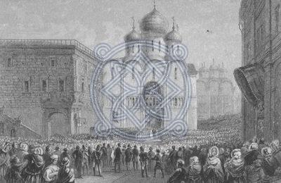 რუსეთის იმპერატორი და დიდებულები უსპენსკის ტაძართან. გრავიურა.
