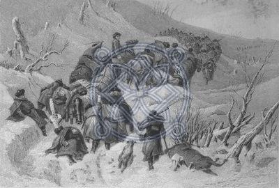 სამხედრო ტექნიკის გადატანა კავკასიონის მთებზე. გრავიურა.