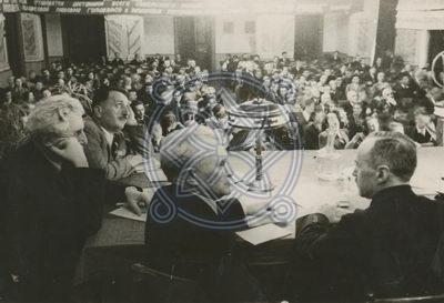 ფოტო № 67/24 განყოფილება: მწერალთა ყრილობები,პლენუმები გადაღების ადგილი: თბილისი ავტორი: პიროვნებები ფოტოზე: შალვა დადიანი, სანდრო შანშიაშვილი, ბ. შიშმარევი, ი. მეშჩანინოვი, აღწერა: საბჭოთა მწერალთა კავშირის საიუბილეო პლენუმი მიძღვნილი ,,ვეფხისტყაოსნის’’750 წლისთავისადმი. პრეზიდიუმში სხედან: პოეტი სანდრო შანშიაშვილი, დრამატურგი შალვა დადიანი, აკადემიკოსები ბ.შიშმარევი და ი.მეშჩანინოვი. თარიღი: 1937 |