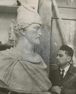 მოქანდაკე კ.მერაბიშვილი შოთა რუსთაველის ბიუსტზე მუშაობის დროს.