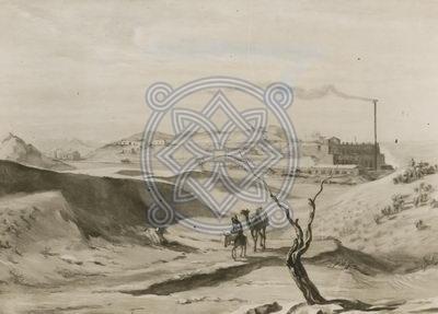 გოგირდის ქარხანა ყარაყუმის უდაბნოში. მხატვარ სადკოვის ნახატის ფოტორეპროდუქცია.
