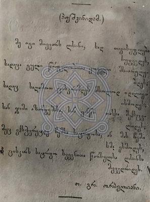 ფოტო № 168/29 განყოფილება: საგამომცემლო და ბეჭდვითი საქმე გადაღების ადგილი: თბილისი ავტორი: პიროვნებები ფოტოზე: გრიგოლ ორბელიანი, აღწერა: გრიგოლ ორბელიანის მიერ ნათარგმნი ა.პუშკინის ლექსი, რომელიც გამოქვეყნდა ჟურნალ ,,ცისკარში,, 1860 წელს. ფოტორეპროდუქცია. თარიღი: 1936 |