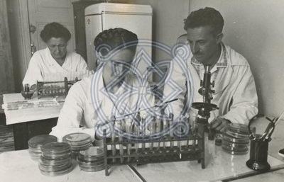 ფოტო № 382/43 განყოფილება: სამეცნიერო-კვლევითი დაწესებულებები (ინსტიტუტები,ლაბორატორიები,საცდელი სადგურები,ზოოლოგიური და ბოტანიკური ბაღები,ნაკრძალები, ობსერვატორიები) გადაღების ადგილი: სოხუმი ავტორი: აღწერა: სოხუმის მაიმუნსაშენის თანამშრომლები ლაბორატორიაში მუშაობის დროს. თარიღი: [1950–იანი] |