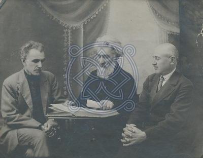 ფოტო № 409/1 განყოფილება: მხატვრული ლიტერატურა,მწერლები,პოეტები,კრიტიკოსები გადაღების ადგილი: თბილისი ავტორი: პიროვნებები ფოტოზე: ალექსანდრე მამულაშვილი, აღწერა: მწერალი და საზოგადო მოღვაწე იოსებ იმედაშვილი (ცენტრში) ჯგუფში თარიღი: 1930–იანი |