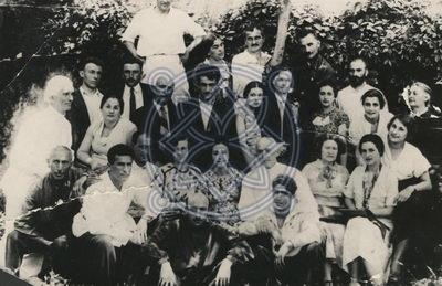 ფოტო № 787/71 განყოფილება: მსახიობები, რეჟისორები, ოპერატორები გადაღების ადგილი: თბილისი ავტორი: პიროვნებები ფოტოზე: ნატო ვაჩნაძე, დუტუ მეგრელი, ალექსანდრა თოიძე, ა. გუგუშვილი, ჩიტოლია ჩხეიძე, კ. ყარალაშვილი, აღწერა: მსახიობები:ნატო ვაჩნაძე, დუდუხანა წეროძე, ალექსანდრა თოიძე, ა.გუგუშვილი, ჩიტოლია ჩხეიძე, კ.ყარალაშვილი და სხვები ჯგუფში. თარიღი: 1930 |