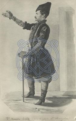 გიორგი ერისთავის კომედია ,,გაყრა,,. ალექსანდრე ერისთავი ბარძიმის როლში. მხატვარ კორადინის ნახატის ფოტორეპროდუქცია.