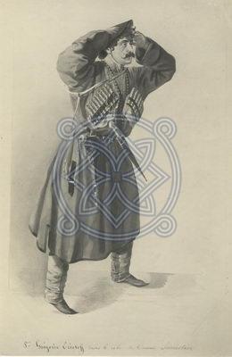 გიორგი ერისთავის კომედია ,,გაყრა,,. გიორგი ერისთავი იმერელის როლში. მხატვარ კორადინის ნახატის ფოტორეპროდუქცია.