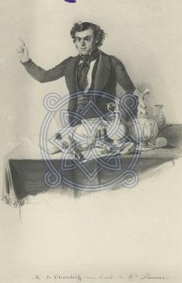 გიორგი ერისთავის კომედია ,,გაყრა,,. შანშიაშვილი თავად რამაზის როლში. მხატვარ კორადინის ნახატის ფოტორეპროდუქცია.
