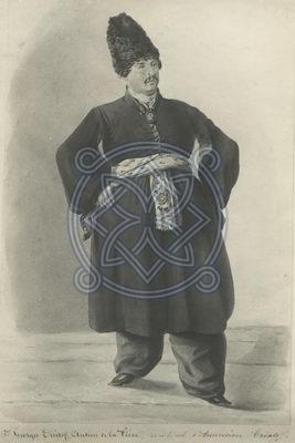 გიორგი ერისთავის კომედია ,,გაყრა,,. ავტორი გიორგი ერისთავი სომეხ ტრდატოვის როლში. მხატვარ კორადინის ნახატის ფოტორეპროდუქცია.
