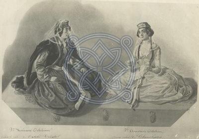 ფოტო № 896/10 განყოფილება: დრამატული თეატრი ავტორი: პიროვნებები ფოტოზე: ქეთევან ორბელიანი, ანასტასია ორბელიანი, აღწერა: გიორგი ერისთავის კომედია ,,გაყრა,,. ქეთევან ორბელიანი (მარცხნივ) თათელა ტრდატოვის როლში და ანასტასია ორბელიანი შუშანას როლში. მხატვარ კორადინის ნახატის ფოტორეპროდუქცია. |