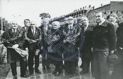 ფოტო № 1212/43 განყოფილება: სახალხო დღესასწაულები, იუბილეები. გადაღების ადგილი: თბილისი ავტორი: პიროვნებები ფოტოზე: ლადო გუდიაშვილი, კონსტანტინე ილურიძე, შუშანა ჩიქოვანი, აკაკი შანიძე, ედუარდ შევარდნაძე, ჯანსუღ ჩარკვიანი, იოსებ ნონეშვილი, მორის ფოცხიშვილი, აღწერა: ქ.თბილისის პირველი საპატიო მოქალაქეები: საქართველოს და სსრკ სახალხო მხატვარი ლადო გუდიაშვილი, სოციალისტური შრომის გმირი კონსტანტინე ილურიძე, პედაგოგი შუშანა ჩიქოვანი, აკადემიკოსი აკაკი შანიძე და თბილისობის ზეიმის მონაწილენი: საქართველოს კპ.ცკ–ს პირველი მდივანი ედუარდ შევარდნაძე, პოეტები ჯანსუღ ჩარკვიანი, იოსებ ნონეშვილი, მორის ფოცხიშვილი და სხვები. თარიღი: 28.10.1979 |