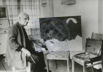 საქართველოს და სსრკ სახალხო მხატვარი, სოციალისტური შრომის გმირი ლადო გუდიაშვილი მუშაობის დროს.