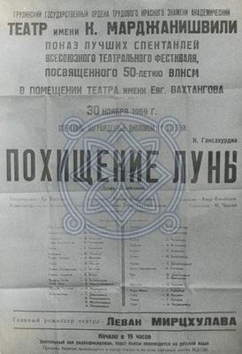 ფოტო № 1212/176 განყოფილება: თეატრალური ფესტივალები გადაღების ადგილი: მოსკოვი ავტორი: აღწერა: კ.მარჯანიშვილის სახ. სახელმწიფო აკადემიური თეატრის სპექტაკლის ,,მთვარის მოტაცება,, აფიშა. სპექტაკლი ნაჩვენები იყო საკავშირო თეატრალურ ფესტივალზე ე.ვახტანგოვის სახელობის თეატრში. ფოტორეპროდუქცია. |