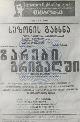 ლადო მესხიშვილის სახ. ქუთაისის სახელმწიფო დრამატული თეატრის სპექტაკლის ,,ზარები გრიგალში,, აფიშა. ფოტორეპროდუქცია.