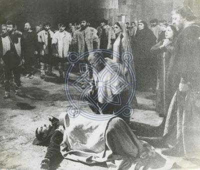 ფოტო № 1212/187 განყოფილება: მხატვრული კინოხელოვნება (კინოგადაღებები,კადრები მხატვრული ფილმებიდან) გადაღების ადგილი: საქართველო ავტორი: პიროვნებები ფოტოზე: დოდო აბაშიძე, თენგიზ მუშკუდიანი, აღწერა: კადრი ფილმიდან ,,დიდოსტატის მარჯვენა,, მამამზე ერისთავი– დოდო აბაშიძე, ჭიაბერი– თენგიზ მუშკუდიანი. თარიღი: 1969 |